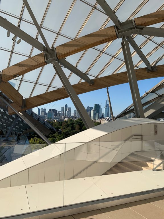 Ein Highlight unseres Parisbesuches erwartet uns nach einer Shuttlefahrt vom Arc de Triomphe aus in der Louis-Vuitton-Fondation, eine von Gehry entworfene Glasplattenarchitektur. Das „vaisseau de verre“ (das Glasschiff) beeindruckt auch ohne Kunstausstellung. Von Schiffssegeln inspiriert geben unterschiedliche Raumblöcke aus Glas, Holz und Stahl den Blick über den Bois de Boulogne, die Banlieue bis zum Eiffelturm frei. Das Sonnenlicht bricht sich zwischen Galerien und Terrassen. Ein schöner Garten findet sich am Fuße der überbauten ehemaligen Bowlingbahn. Von hier erscheint dem Besucher die Glaswolke geometrisch sich aufplustern wie eine Brücke zwischen Erde und Luft.
