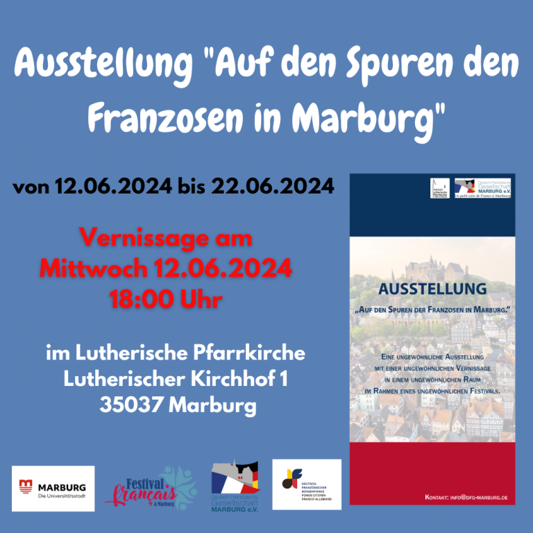 Die Austellung ist vom 12. bis zum 22. Juni 2024 in der Lutherischen Pfarrkirche (Marburg) zu sehen. Sie findet im Rahmen des Festival Français à Marburg statt und wird organisiert von der DFG Marburg.