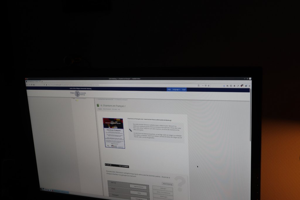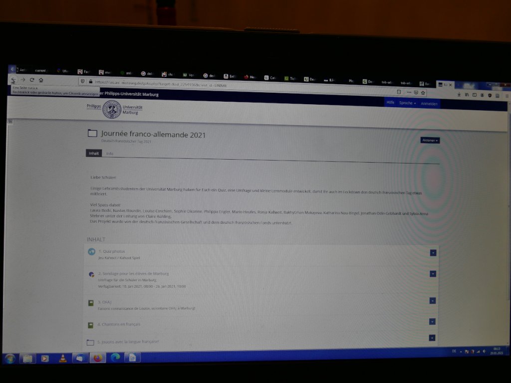 En raison de la pandémie de coronavirus, les écoles étaient fermées en ce début d'année. Il ne fut donc pas possible d'aller à la rencontre des élèves comme les autres années. Mais différentes tâches numériques ont été créées par les étudiants, sous la direction de Claire Köhling et mises à la disposition des professeurs de français des cinq lycées de la ville de Marbourg, et d'un professeur d'allemand d'un collège de Poitiers, qui les ont distribués à leurs élèves. Un programme bilingue, plutôt ludique et très diversifié était proposé: un quiz photo, un reportage sur la volontaire de l'OFAJ, Louise, une émission musicale radiophonique, des jeux sur la langue française et un sondage en ligne sur le jumelage Marbourg-Poitiers. Pas moins que 320 élèves de Marbourg et 62 de Poitiers ont participé aux actions qui étaient disponibles sur le serveur de l'Université pendant une semaine, du 20 au 27 janvier 2021.