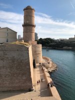 Die gewaltige Kathedrale („la Major“) grüßt schon von Seeseite fast wie ein Leuchtturm die ankommenden Schiffe; die goldene Madonna der Basilika „Notre Dame de la Garde“, liebevoll „La Bonne Mère“ genannt, thront als Wahrzeichen über der Stadt. Eine weiße Bimmelbahn erspart uns den anstrengenden Aufstieg. Das Panorama einfach grandios! Die „Abbaye St.Victor“, 1500 Jahre lang mediterrane Hochburg des Katholizismus, aber vielfach zerstört, birgt heute in der Krypta eine umfangreiche Sammlung frühchristlicher Sarkophage.