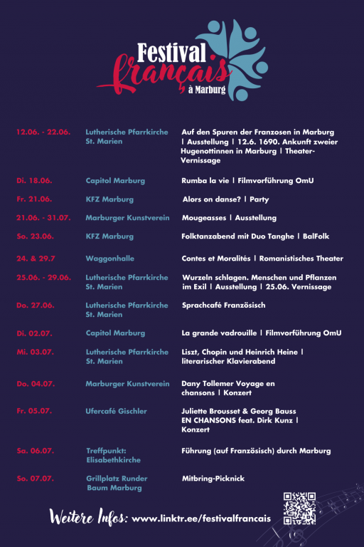 Vom 12. Juni bis zum 7. Juli veranstaltet die Deutsch-Französische Initiative Marburg ein Festival der Frankophonie mit Konzerten, Theater, Ausstellungen, Führungen und Partys.