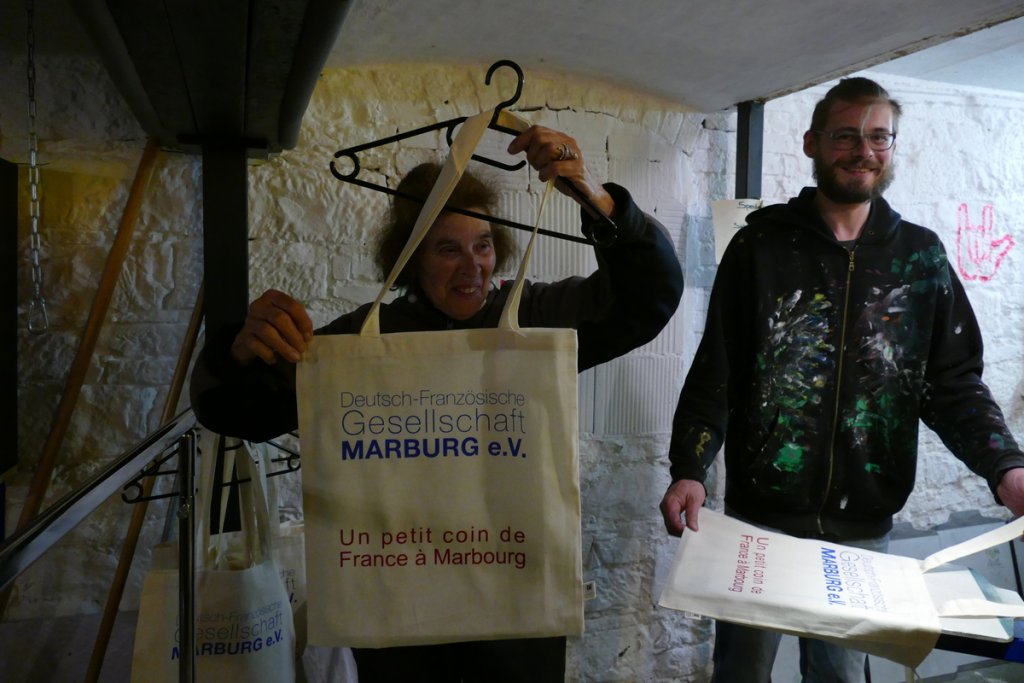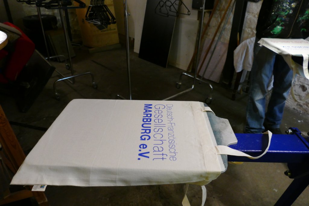 Dank des "Mosaikprojekts" (initiiert von Andrea Fritsch) hatten wir die Möglichkeit an einem Siebdruck-Workshop teilzunehmen, der von artgerechtes.de unter der Leitung von Benedikt Späker angeboten wurde. Wir konnten unseren Slogan "Deutsche-Französische Gesellschaft Marburg - Un petit coin de France à Marbourg" auf Leinentaschen drucken. Herzlichen Dank an Andrea, Alex und Bene!